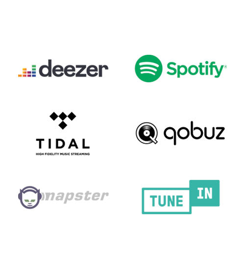 Use the Deezer & Spotify platforms, famous for their extensive music catalogue, or Qobuz & Tidal, renowned for their high-resolution libraries. Not forgetting the unlimited access to all the internet radio stations around the world via TuneIn.